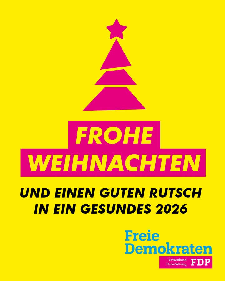 🎄 Frohe Weihnachten 🎄 Wir wünschen allen Familien, Bürgerinnen und Bürgern, Freundinnen und Freunden eine besinnliche und entspannte Weihnachtszeit. Zeit für Ruhe, für schöne Gespräche, für gemeinsames Lachen – und für all das, was im Alltag oft zu kurz kommt. Möge diese Zeit Raum geben, das vergangene Jahr in Ruhe Revue passieren zu lassen und neue Kraft zu schöpfen. Für das kommende Jahr wünschen wir vor allem Gesundheit, Zuversicht, Erfolg und viele erfüllte Wünsche. Genießen Sie die Feiertage im Kreise Ihrer Liebsten ✨ Ihr FDP-Ortsverband Hude-Wüsting 💛